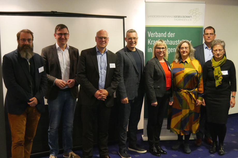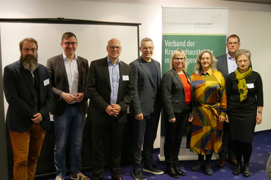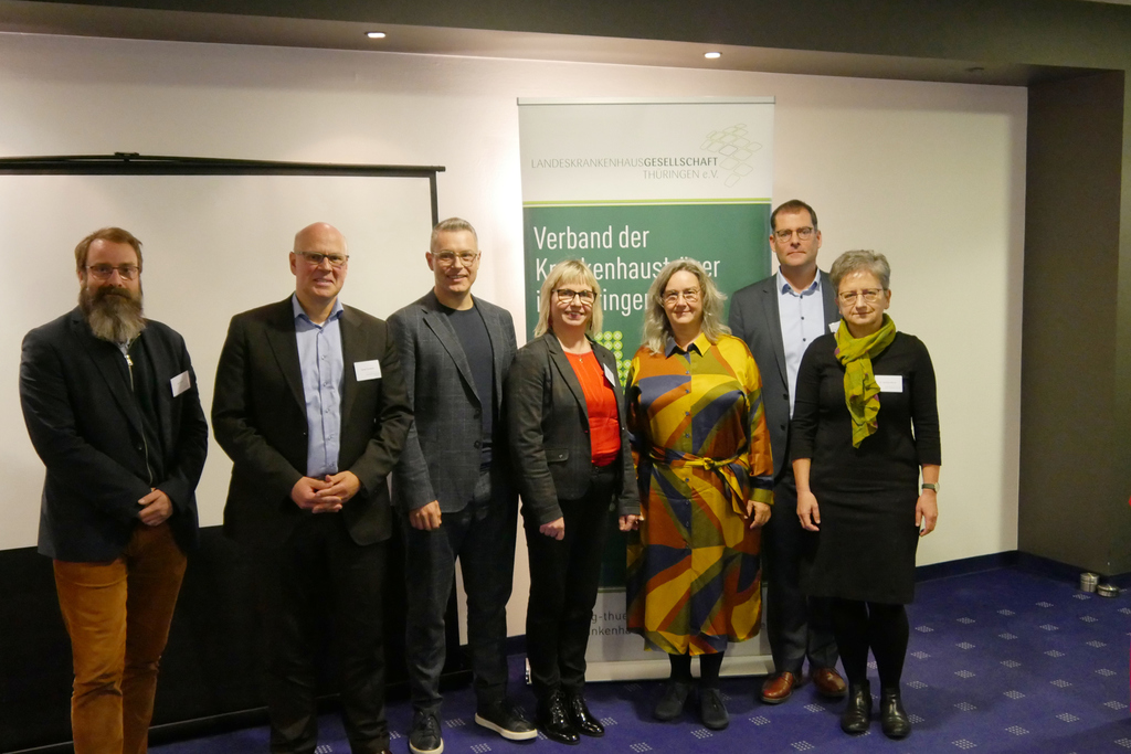 v.l.n.r.: Ralf Plötner (DIE LINKE), Christoph Zippel (CDU), Rainer Poniewaß (Geschäftsführer der LKHG), Robert-Martin Montag (FDP), Babett Pfefferlein (BÜNDNIS 90/DIE GRÜNEN), Ministerin Heike Werner (Ministerium für Arbeit, Soziales, Gesundheit Frauen und Familie, TMASGFF), Dr. Michael Mörsch (Leiter Geschäftsbereich Politik, DKG), Dr. Gundula Werner (Vorstandsvorsitzende der LKHG)