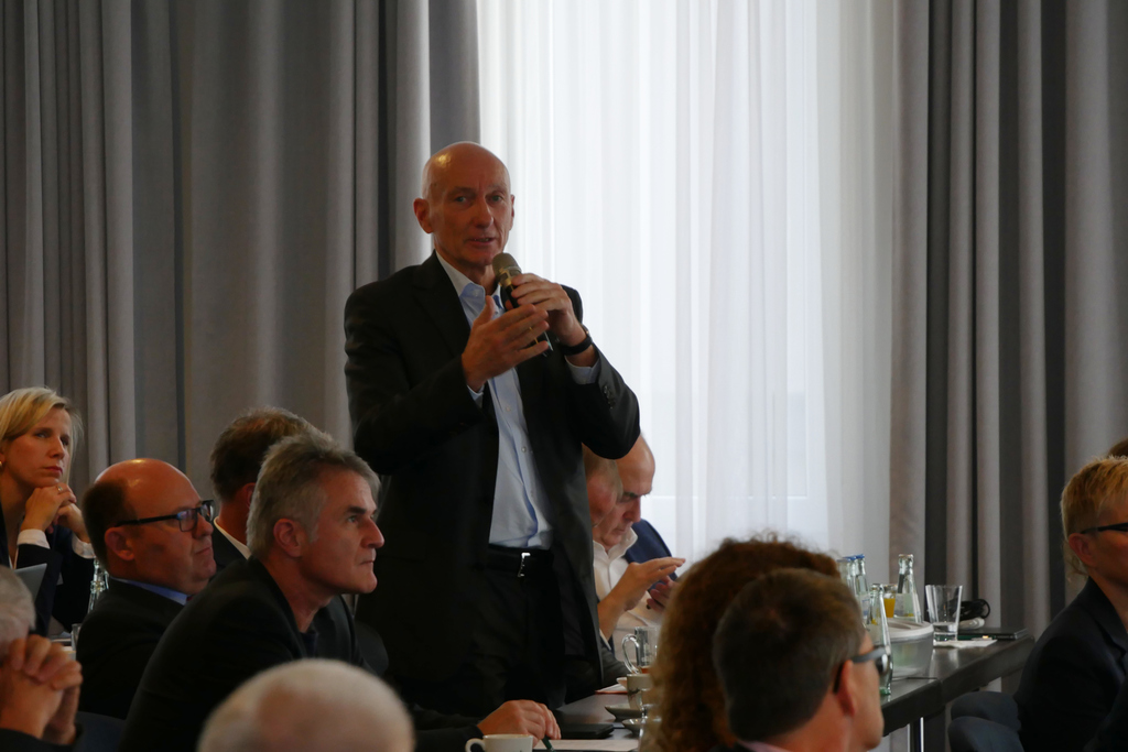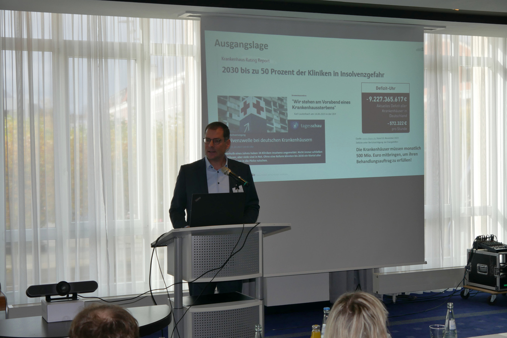 Dr. Michael Mörsch, Leiter des Geschäftsbereichs Politik der Deutschen Krankenhausgesellschaft (DKG), unterstrich diese Forderung und stellte in seinem Vortrag die Situation der Krankenhäuser in Deutschland dar.